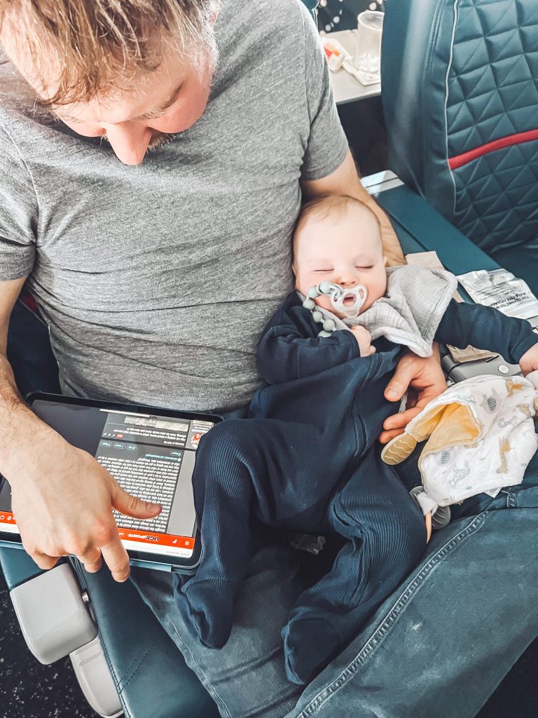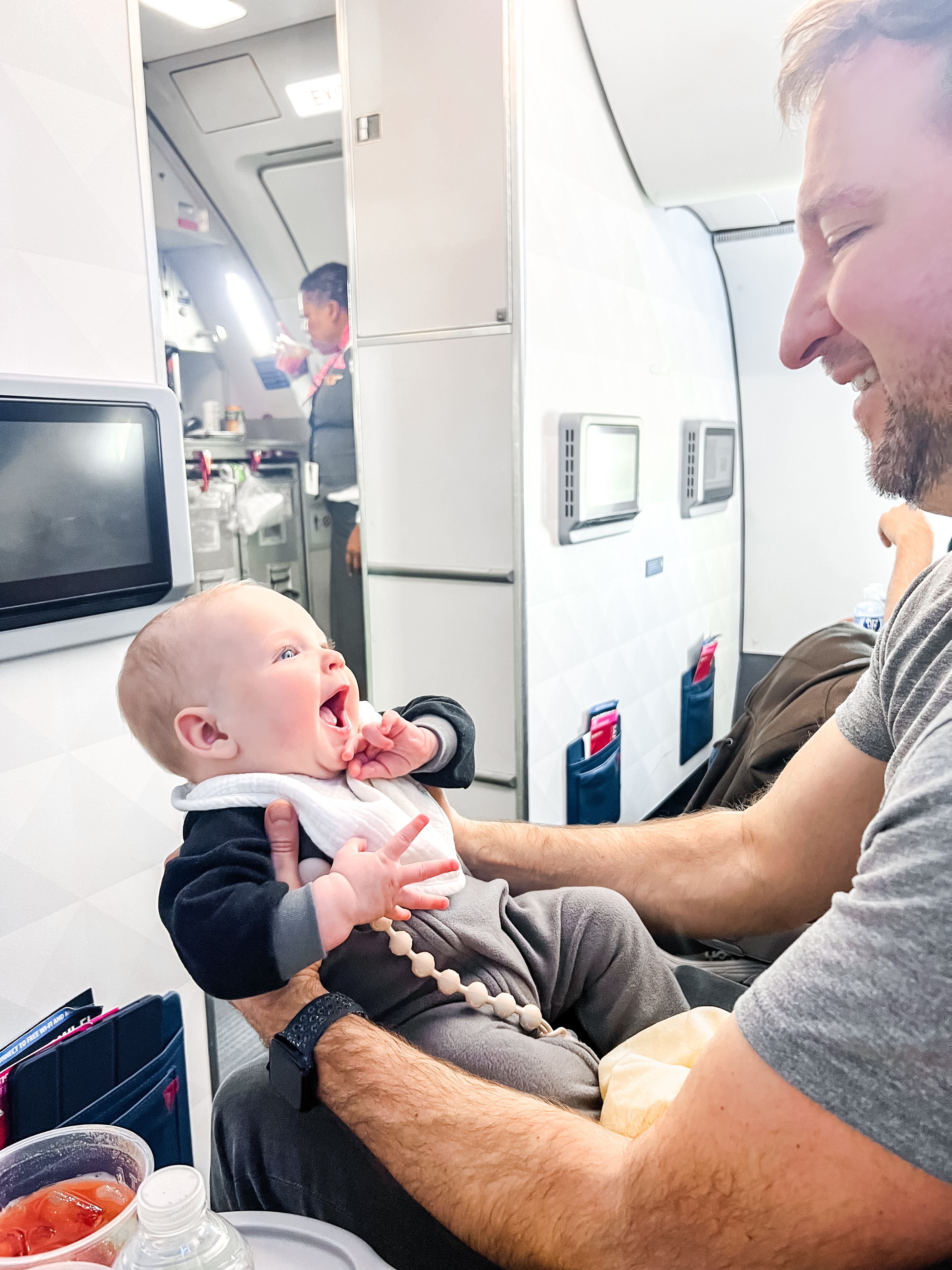 There are changing tables in the bathrooms on Delta flights, but we were able to just change him on the seat since it was only us in the row. I always keep my little portable diaper station with me, as well as diaper baggies (AKA doggie poop bags with better branding) if I’m out somewhere to minimize other people smelling dirty diapers.