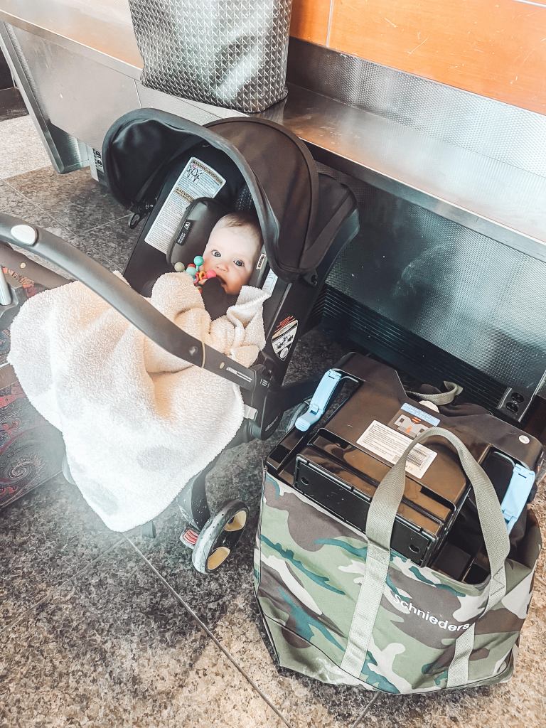 We rolled Will through the airport in the Doona and carried the carseat base and cover in our giant LL Bean bag. We gate-checked the Doona right before getting on the plane, which was perfect because we just attached the base, put everything in the case, and it was there waiting for us when we got off. From there, we just threw our diaper bag and extra stuff into the now empty tote bag and stuffed that into the overhead bins.